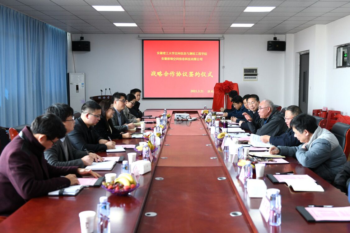 与安徽前锦空间信息科技有限公司战略合作协议签约仪式在求本楼北503会议室隆重举行。副校长郑明东出席会议并讲话,学院领导、老师代表参加会议。签约仪式由学院党委书记吴军主持。