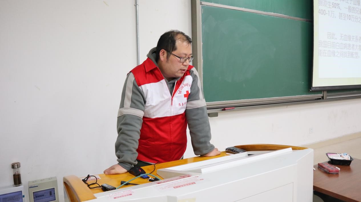 在明理南110教室开展“造血干细胞知识介绍及工作流程”主题志愿者培训讲座。淮南市红十字会党支部书记赵宝、市红十字会科员穆敏主讲,院红十字志愿服务队、校爱心社140余名志愿者参加活动。
