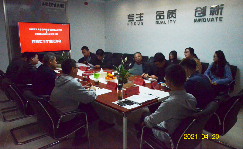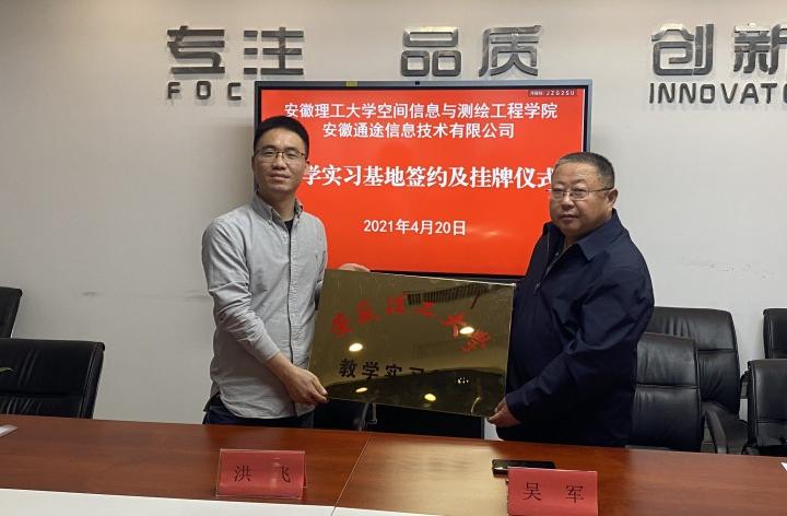为深入了解实习学生的工作、生活情况,推动校企合作向纵深发展,4月20日下午,学院党委书记吴军等一行5人赴安徽省通途信息技术有限公司看望慰问在实习学生并举行实习基地签约与挂牌仪式,受到通途公司总经理叶林海、安徽省GIS技术研究所所长叶峰等的热烈欢迎。