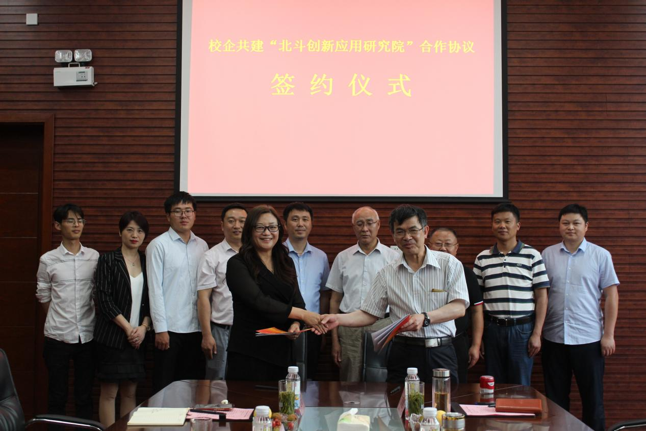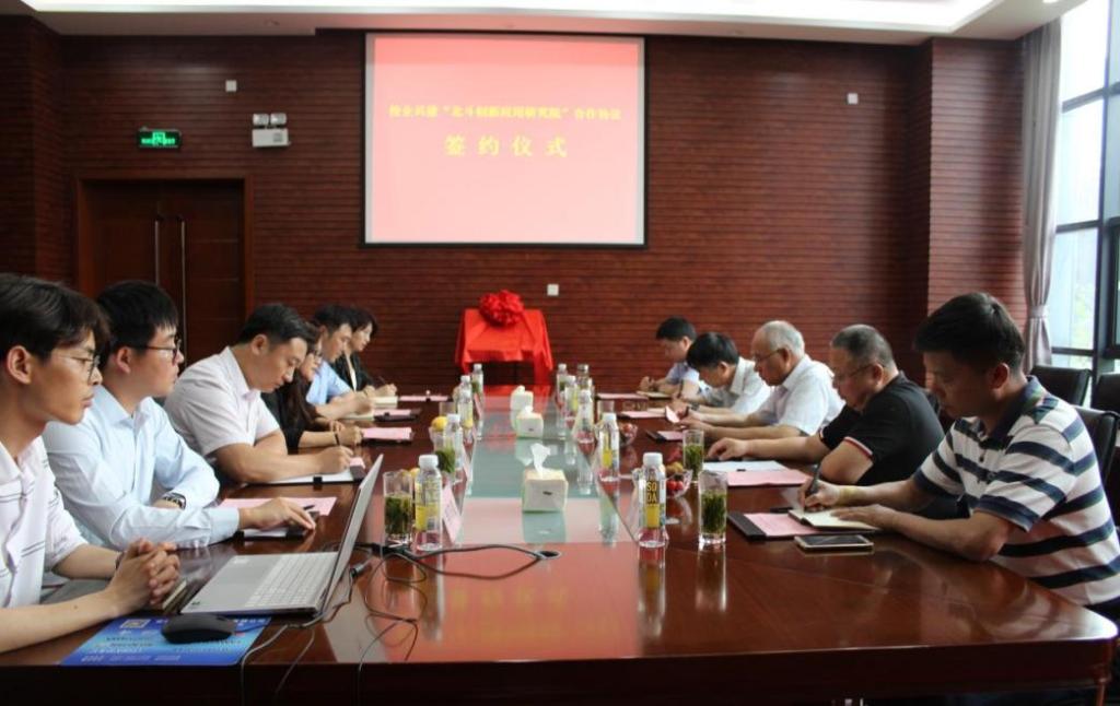 余学祥和盛鸣红代表院企双方签署《共建“北斗创新应用研究院”合作协议》,郑明东和盛鸣红为“北斗创新应用研究院”揭牌。