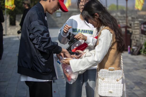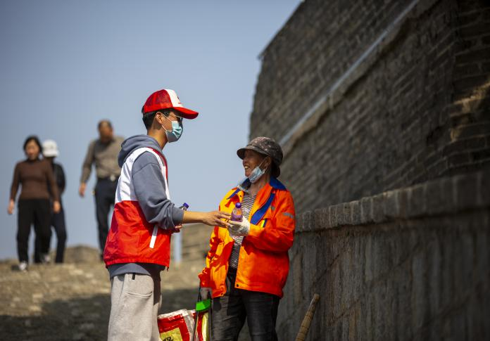 志愿者们手带白手套,穿戴红色志愿者马甲,捡拾古城内的路面垃圾,用靓丽的红色身影发扬着不怕脏不怕累的精神。