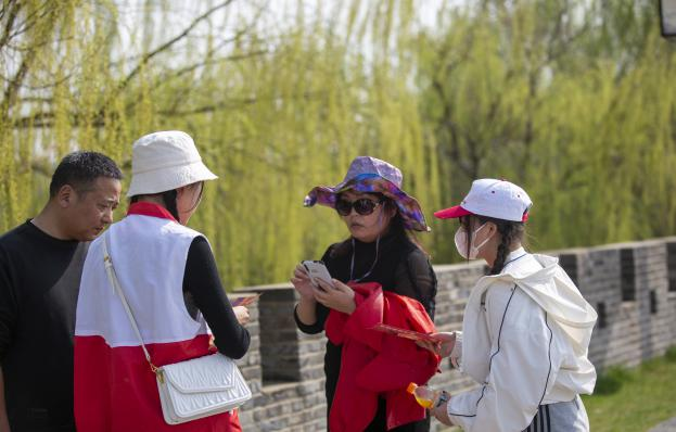 志愿者们身着红马甲、戴着红帽子,分组到达各处,手拿文明旅游宣传单,向旅游者们宣传文明旅游的相关细则,对他人不文明的行为及时进行劝导。督促旅游区的群众们养成良好的旅游习惯,树立良好的公德意识,做到文明自身、文明行动、文明旅游。