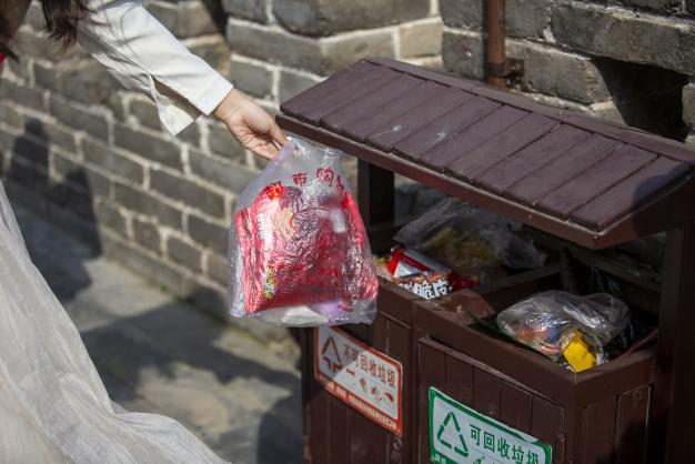 志愿者们将捡拾起的垃圾放入自身准备好的垃圾袋并丢入垃圾桶中