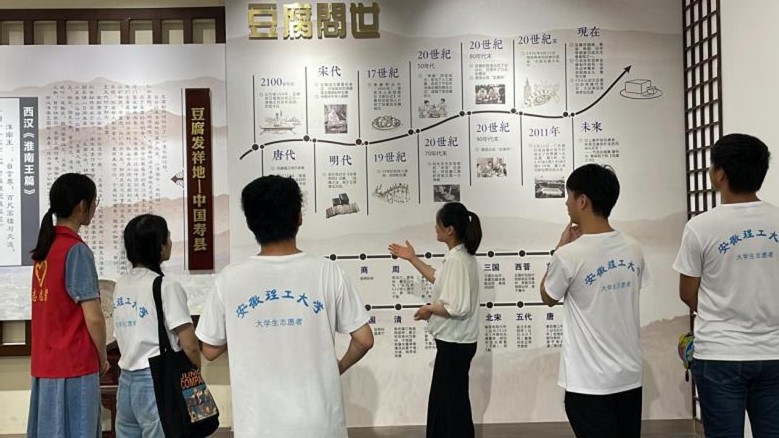 在中国豆腐主题文化园,队员们沉浸在豆腐文化的丰富历史之中。通过参观文化园,他们深入感受到豆腐产业的博大精深,以及豆腐在中国人日常生活中的重要地位。豆腐作为重要的特色产业,为乡村振兴作出了重要贡献。他们表示要将这一独特的传统产业传承发扬,让更多人了解和喜爱这一中国特色的食品文化。团队成员周乐说:“通过参观豆腐的发源和历史,我深刻认识到特色产业对于乡村振兴的意义,我们要积极参与特色产业的发展,为乡村振兴贡献自己的力量。”