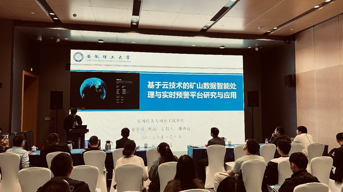 韩雨辰代表余学祥教授团队在“时空大数据技术与应用研究”论坛上做了题为“基于云技术的矿山数据智能处理与实时预警平台研究与应用”的学术报告,介绍了团队近年来的主要目标任务、获得的主要建设成果,重点介绍了矿山数据智能处理与实时预警平台及其关键技术。