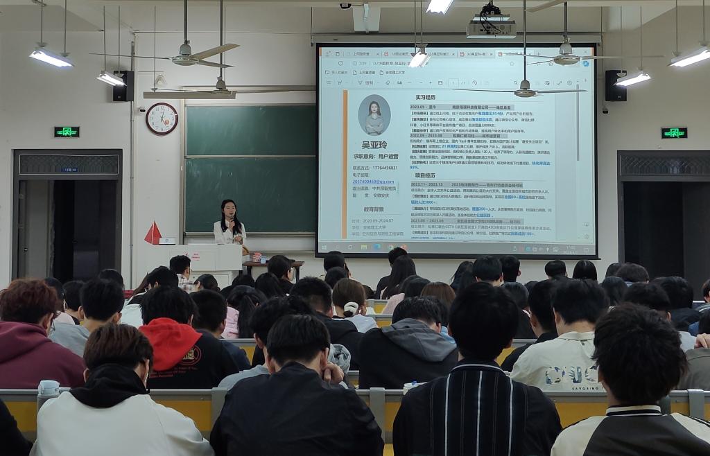 于明理楼202开展“学长学姐说就业”经验分享会。本次分享会由2024届毕业生吴亚玲主讲,2021级140余名本科生参会。