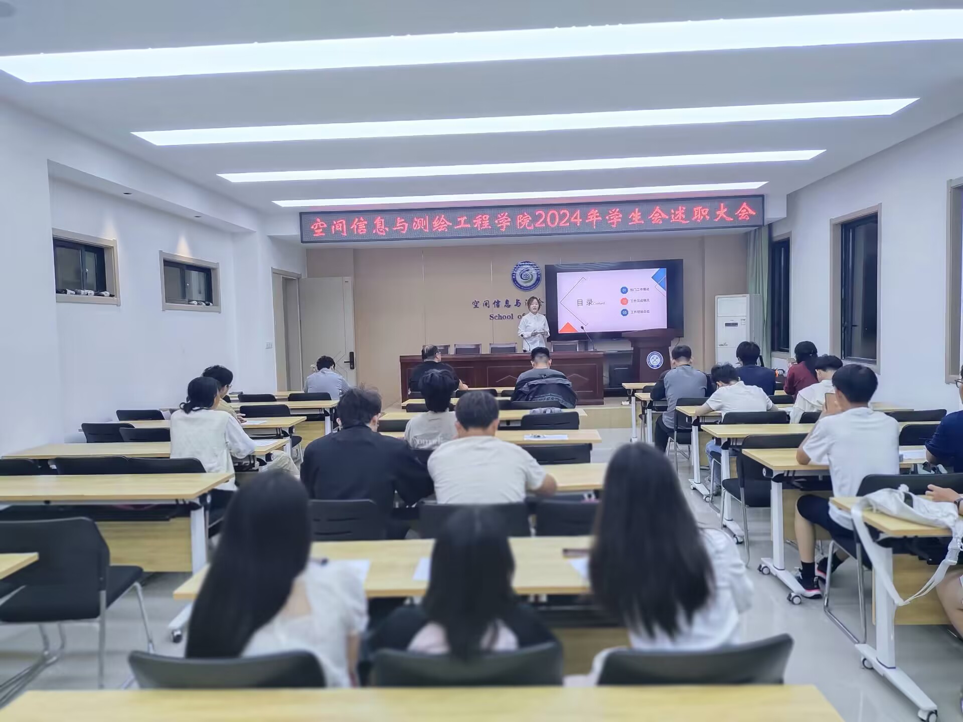 团委在学院楼北204召开2023-2024学年度团学组织述职评议会。院党委副书记孟静、院团委书记、辅导员、学生代表参会。学院团学组织各部门学生干部参加述职。