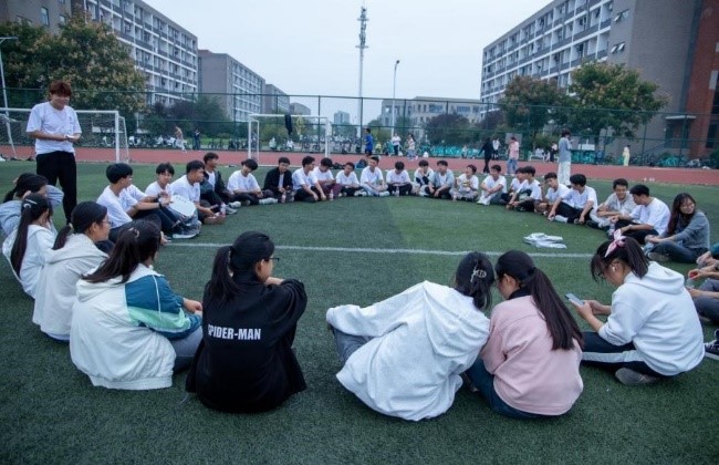 在操场上新生开展团辅活动
