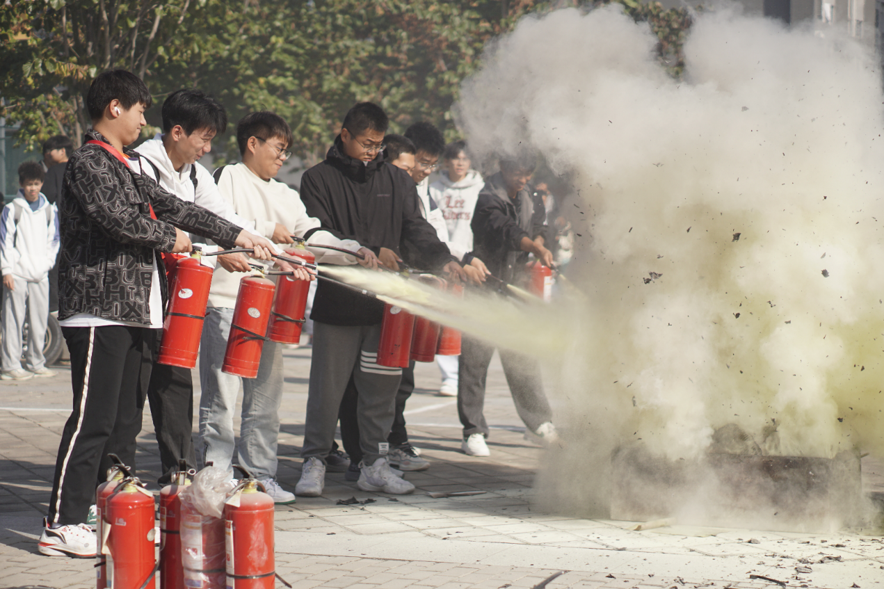 疏散演练结束后,全部演练师生在楼前广场开展灭火器使用技能培训。保卫处工作人员针对不同危险源特点,详细讲解了干粉灭火器、二氧化碳灭火器适用条件和使用方法,教育师生针对不同起火原因合理选用不同灭火器。在安保人员的指导下,学生们轮流上阵,亲身体验了如何正确使用干粉灭火器扑灭初期火灾,确保参与者熟练掌握这一基本自救技能。
