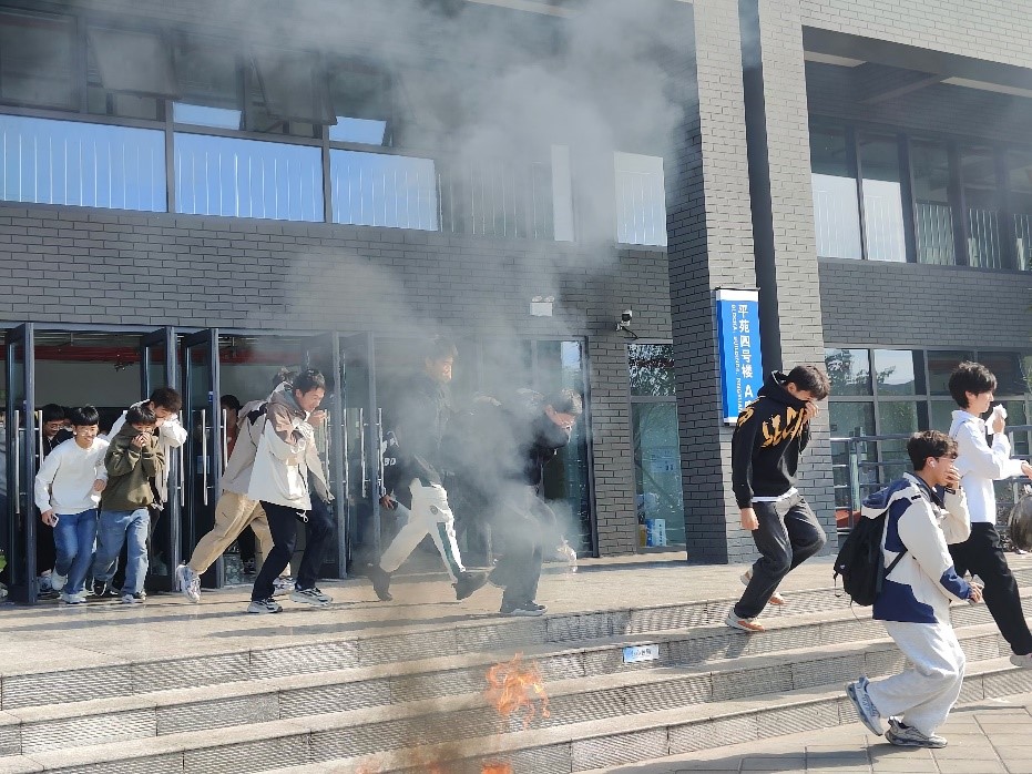 随着模拟烟雾扩散和大楼警报响起,全体师生迅速进入紧急状态,班级安全委员及辅导员老师立即到达指定岗位,引导学生快速疏散。同学们用湿毛巾捂住口鼻,弯腰低头快速前行,沿着预定的疏散路线,有序地撤离到安全区域,演练流程完成时间不超过6分钟。整个过程紧张而有序,展现出学院师生良好的消防安全素养和应急反应能力。
