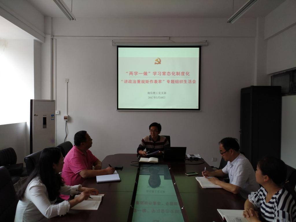 会议还就《地信教工党支部关于在推进“两学一做”学习教育常态化制度化中开展“讲政治、重规矩、作表率”专题教育的实施方案》和对接本科生党支部进行了讨论。